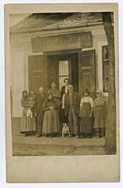 Süveges Jenő családjával és alkalmazottaival kelmefestő, ruhatisztító üzlete előtt 1910-es évek