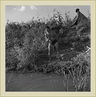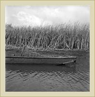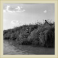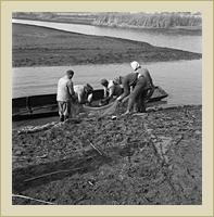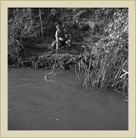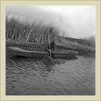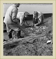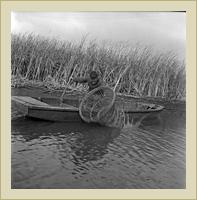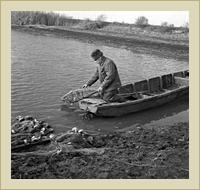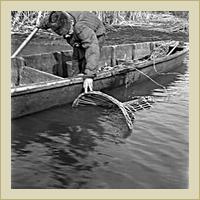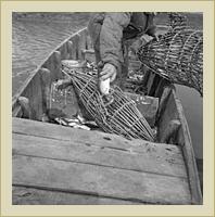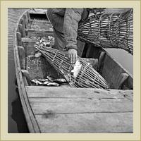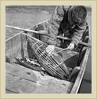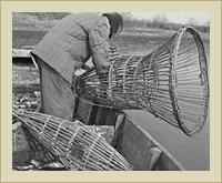 Kun László, öreg halász sűrű fonatú vesszővarsával.