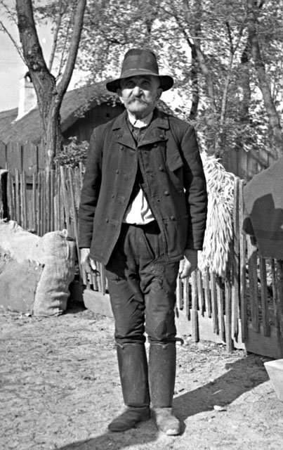 Szarvasi népviselet. Frankó Márton ünneplőben, ú.n. csárdás viseletben (a kék posztó ruhát Zvara Márton varrta 1897-ben.)