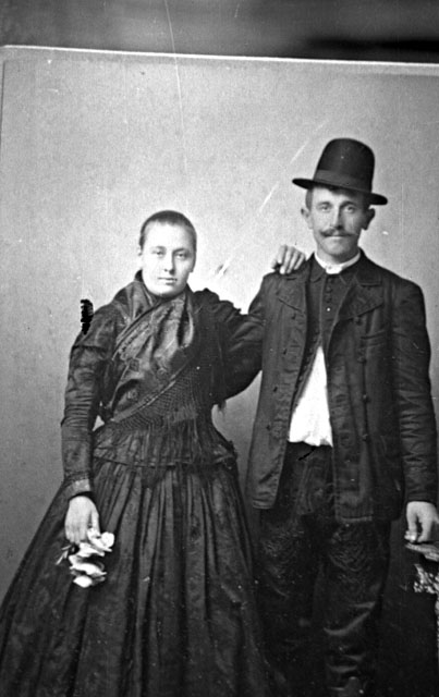 Szarvasi népviselet. Styevcsik György és felesége, 1908. (A férfi “csárdás” kalapban.).