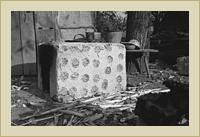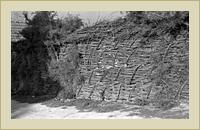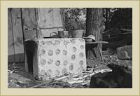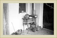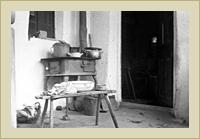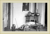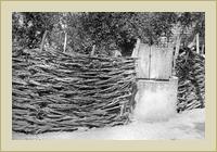 | Tűzhely és pad edényekkel a folyosón. | Fonott kerítés | Fonott kerítés deszkaajtóval. |