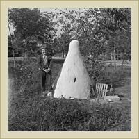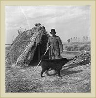 | Horgáts Sándor maga készítette kunyhója előtt. | | |