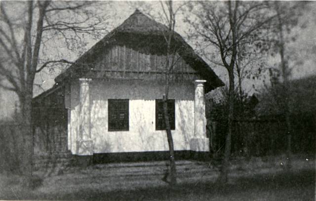 Ház, falazott oszlopokon, deszka oromzattal.