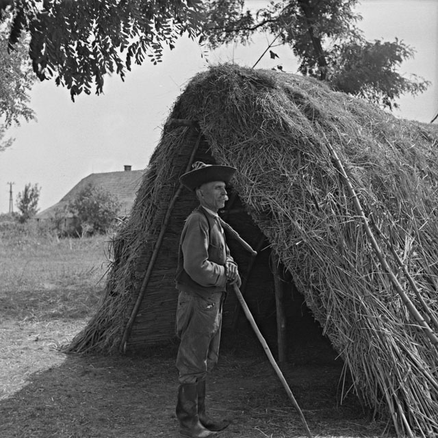F: Tóth Gyula, gulyás szalmával fedett kunyhója előtt.