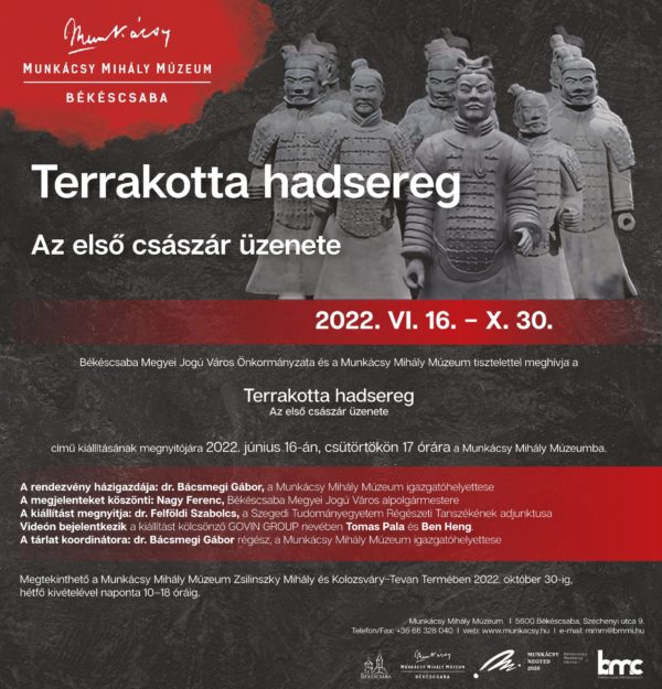 A Munkácsy Mihály Múzeum 2022. június 16. – október 30. között ad otthont a Terrakotta hadsereg – Az első császár üzenete című tárlatnak. Az időszaki kiállítás megnyitó ünnepségére 2022. június 16-án, csütörtökön 17 órai kezdettel kerül sor a múzeum Pátkai Ervin Termében. Az eseményre szeretettel várunk minden érdeklődőt!