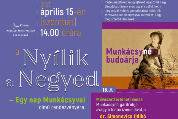 A Munkácsy Mihály Múzeum 2023. április 15-én, szombaton 14.00-tól szeretettel vár minden kedves érdeklődőt a Munkácsy Negyed kulturális intézményei által közösen szervezett idei első, Nyílik a Negyed – Egy nap Munkácsyval című kiemelt rendezvény tartalmasnak ígérkező múzeumi programjaira.