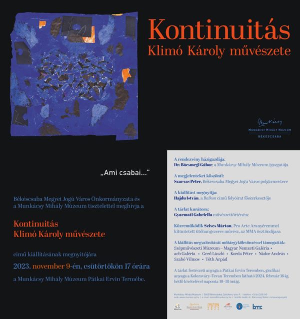 Az „Ami csabai” sorozatban „Kontinuitás. Klimó Károly művészete” címmel nyitja meg kapuit múzeumunk következő időszaki kiállítása 2023. november 9-én, csütörtökön 17.00-kor a Pátkai Ervin Teremben. A megnyitó rendezvényre minden érdeklődőt szeretettel várunk!