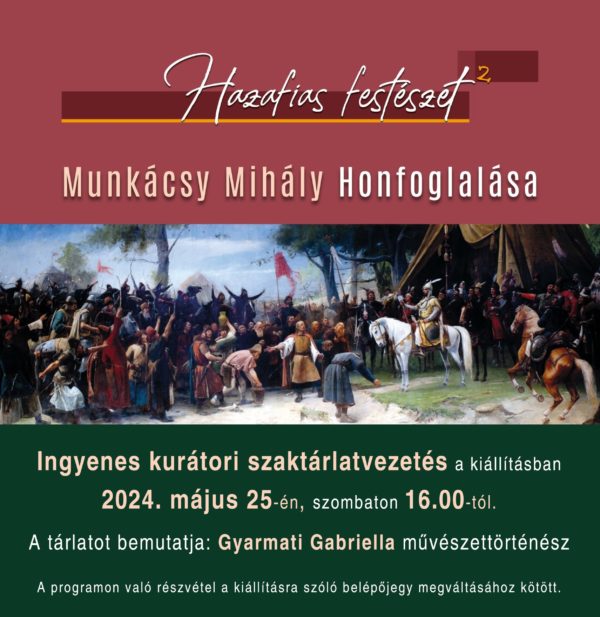 A nagy érdeklődéssel kísért programunkat 2024. május 25-én, szombaton 16.00-tól újból megismételjük! A tárlatvezetés során Gyarmati Gabriella művészettörténész Munkácsy Mihály egyik legismertebb alkotásának, a Honfoglalás című kolosszálkép születésének történetét meséli el, bemutatva a mű alapos előkészítési és elkészítési folyamatát. Mindeközben tanúi lehetünk a festmény párizsi bemutatójának és a festőművészt aggodalommal eltöltő hazai fogadtatásának.Végül megnyugvással nyugtázhatjuk:…