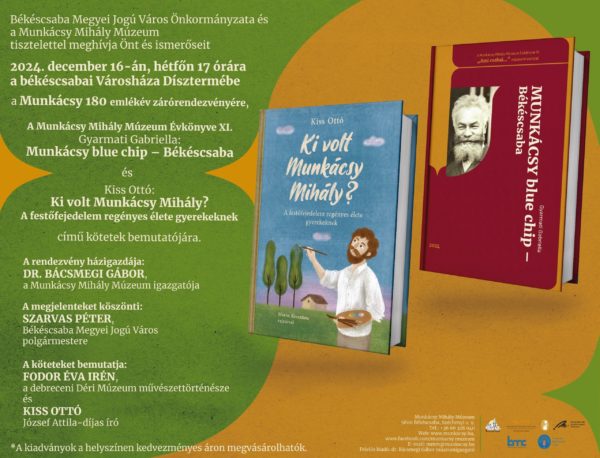 Szeretettel meghívunk minden érdeklődőt 2024. december 16-án, hétfőn 17 órára a békéscsabai Városháza Dísztermébe a Munkácsy 180 emlékév zárórendezvényére, A Munkácsy Mihály Múzeum Évkönyve XI., Gyarmati Gabriella: Munkácsy blue chip – Békéscsaba és Kiss Ottó: Ki volt Munkácsy Mihály? A festőfejedelem regényes élete gyerekeknek című kötetek bemutatójára. A nagyobb méretben való megtekintéshez kattintson a képre!