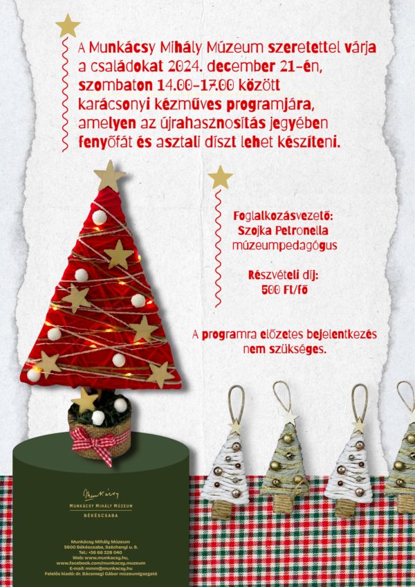 Szeretettel várjuk a családokat 2024. december 21-én, szombaton 14.00–17.00 között az év utolsó múzeumi kézműves programjára, amelynek keretében az újrahasznosítás jegyében „fenyőfa” és asztali dísz készítésével hangolódunk a közelgő ünnepre. Foglalkozásvezető: Szojka Petronella múzeumpedagógus Részvételi díj: 500 Ft/fő