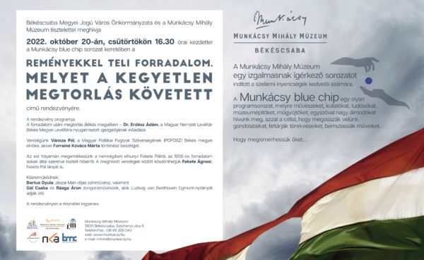 Szeretettel várunk minden érdeklődőt 2022. október 20-án, csütörtökön 16.30 órai kezdettel az 1956-os forradalom és szabadságharc évfordulója alkalmából megrendezésre kerülő „Reményekkel teli forradalom, melyet a kegyetlen megtorlás követett” című ünnepi programunkra. A rendezvényen a részvétel ingyenes! A nagyobb méretben való megtekintéshez kattintson a képre!