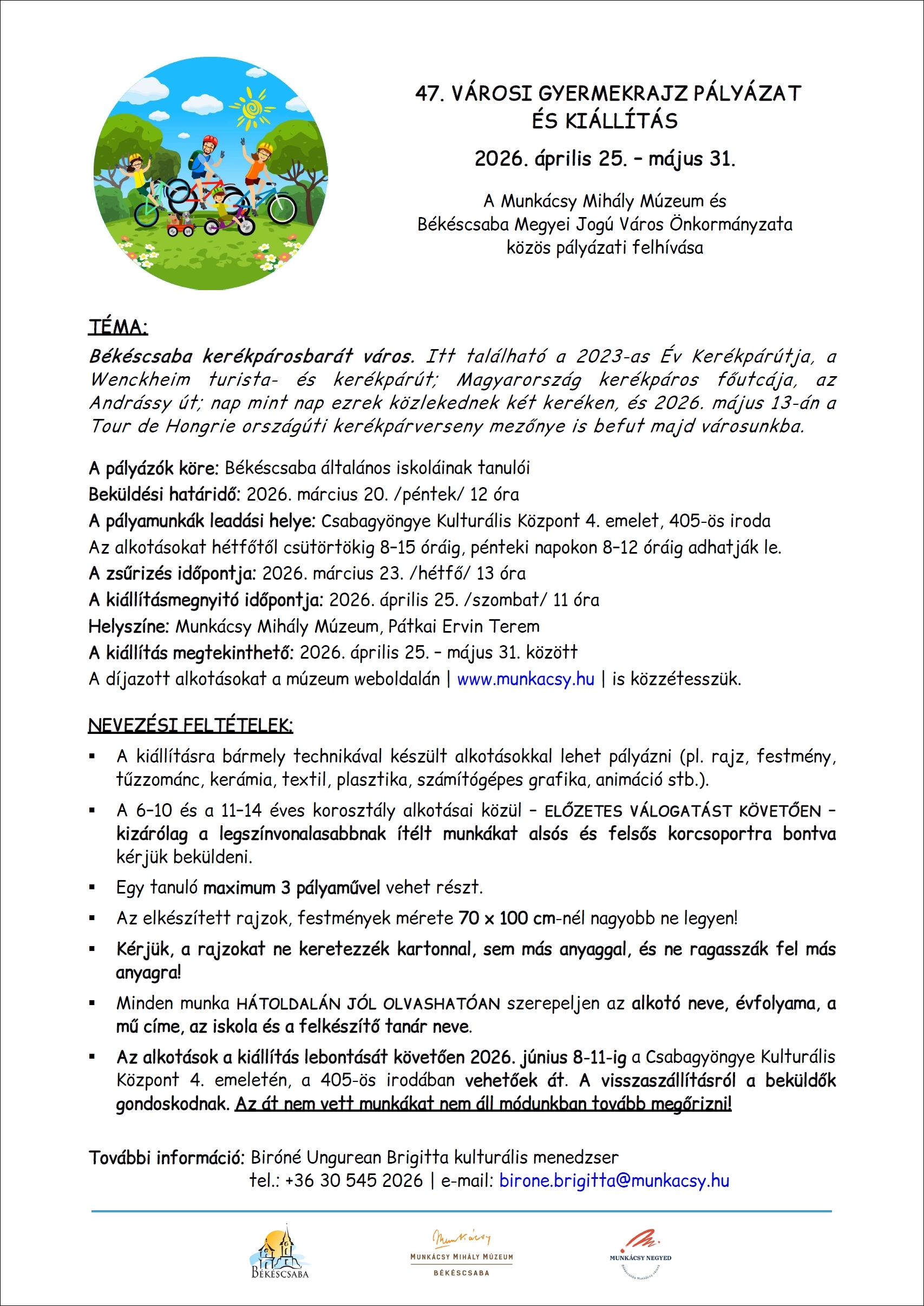 A Munkácsy Mihály Múzeum ebben az évben „Békéscsaba, a kerékpárosbarát város” tematikával hirdeti meg a Csabai Kulturális Játékok keretében a 47. Városi Gyermekrajz Pályázatot.