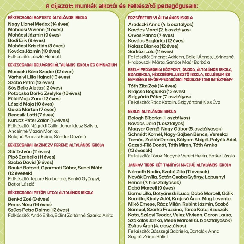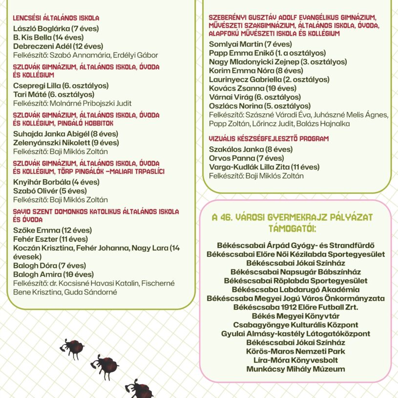 A 46. Városi Gyermekrajz Pályázat díjazott alkotásait bemutató galéria a képre kattintva nyitható meg, amelynek megtekintéséhez kellemes időtöltést és jó szórakozást kívánunk! 2025-04-08Kapcsolódó cikkekKarácsonyi Könyvvásár2025-12-02Barlangok, ásványok, őskövületek – VIII. Magyar-Román Határmenti Konferencia2025-11-20Művészeti LEGmustra: Munkácsy Mihálytól Fajó Jánosig2025-11-17TRENDben vagyunk – fiatal divattervezők fókuszban 2025-10-30November 1-jén zárva tart a múzeum2025-10-29Öltözzük magunkat boldoggá – tudatosan! Mengyán Eszter előadása2025-10-22