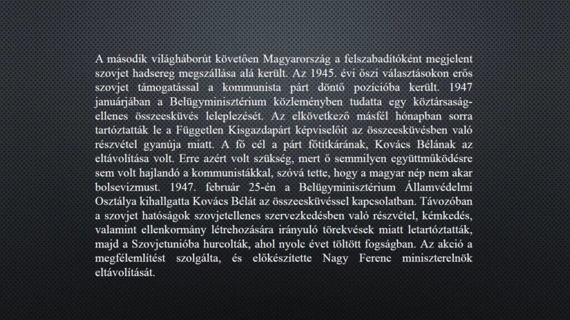 Az Országgyűlés 2000. június 16-án hatályba lépett határozatával minden év február 25-ét a Kommunizmus Áldozatainak Emléknapjává nyilvánította. 1947-ben ezen a napon a megszálló szovjet hatóságok jogellenesen letartóztatták, majd a Szovjetunióba hurcolták Kovács Bélát, a Független Kisgazdapárt főtitkárát.