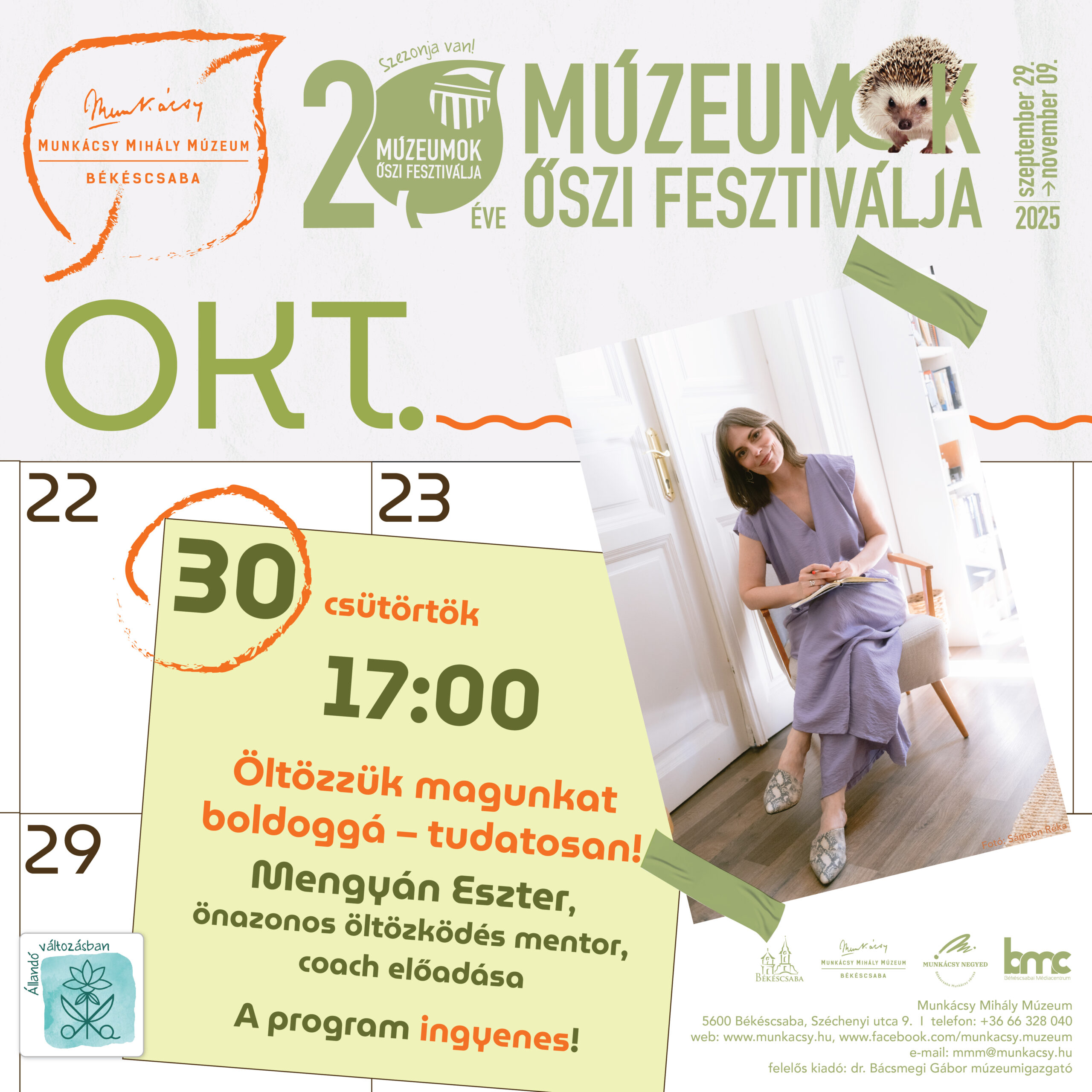A Múzeumok Őszi Fesztiválja országos programsorozat keretében 2025. október 30-án, csütörtökön 17 órai kezdettel Mengyán Eszter önazonos öltözködés mentor, coach, a Helló, slow fashion! c. könyv szerzője tart előadást a divatipar jelenlegi problémáiról, kitérve arra, hogy miért nehéz mindezt a fogyasztói társadalomba belenőve kezelni.