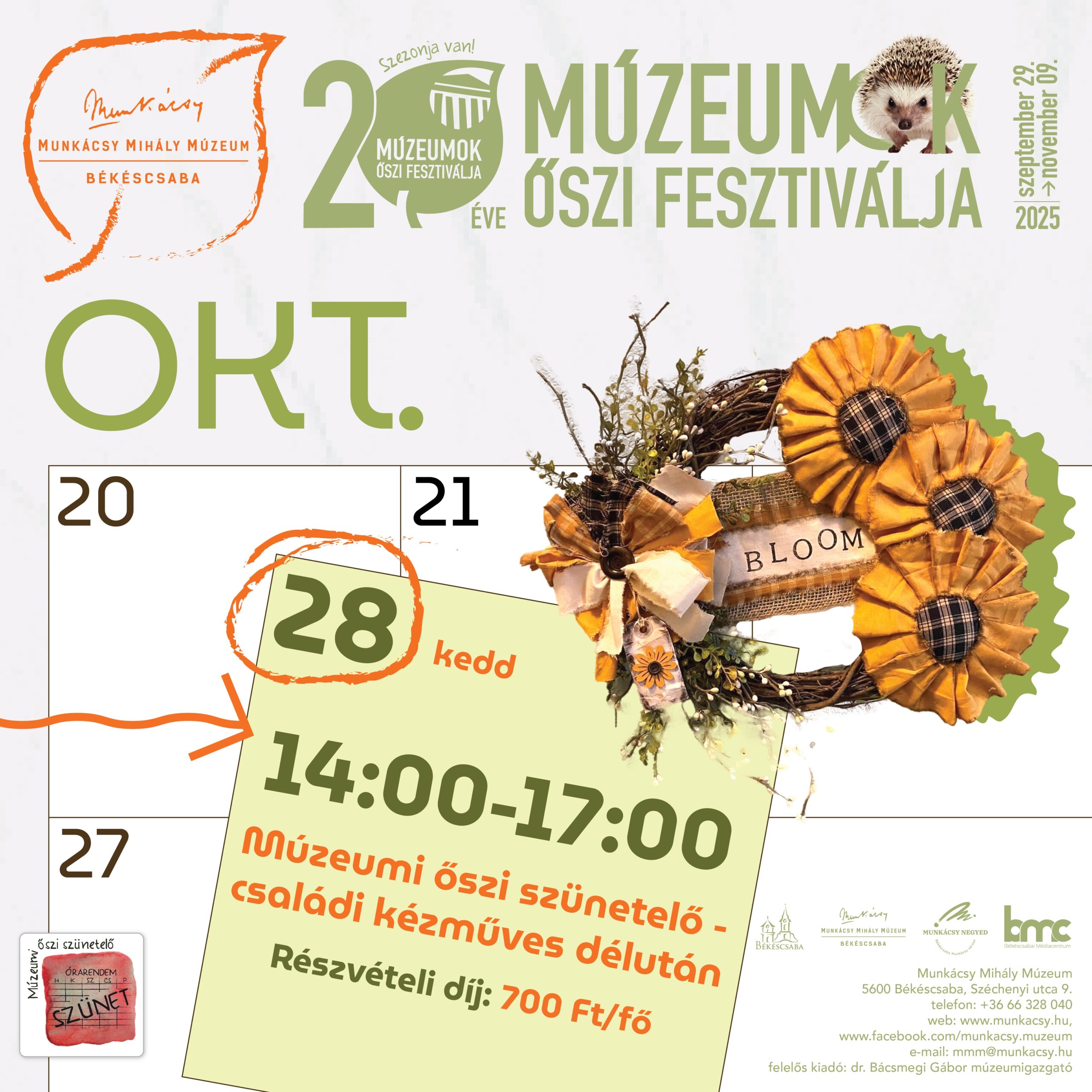 Szeretettel várunk minden érdeklődőt 2025. október 28-án, kedden 14.00–17.00 között az Őszi szünetelő c. családi kézműves programunkra, amelynek keretében az újrahasznosítás jegyében ruhaanyagok felhasználásával egyéni stílusú, mutatós ajtódíszeket fogunk készíteni.