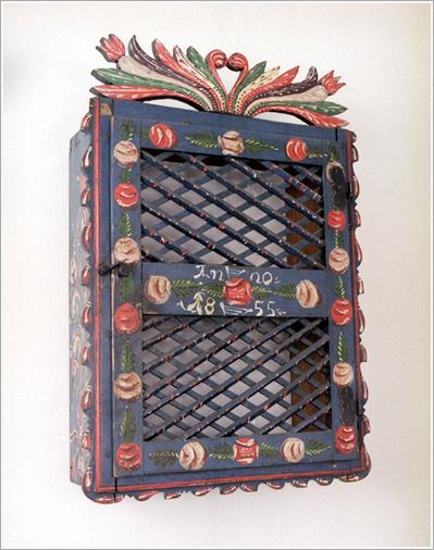 "Origin: Békéscsaba Technique: Made of pine-wood, lattice door, dissected at the top: carved leaves, tulip, red flowers on dark green basis, writing: ""Anno 1855"" Size: L: 49 cm H: 71 cm W: 19 cm"