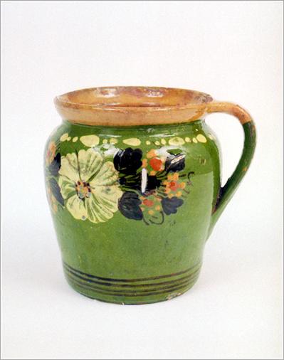 Origin: Békéscsaba Technique: Green-glazed ceramic pot with brown, white yellow flowers. Size: H: 17 cm Bottom: 15 cm