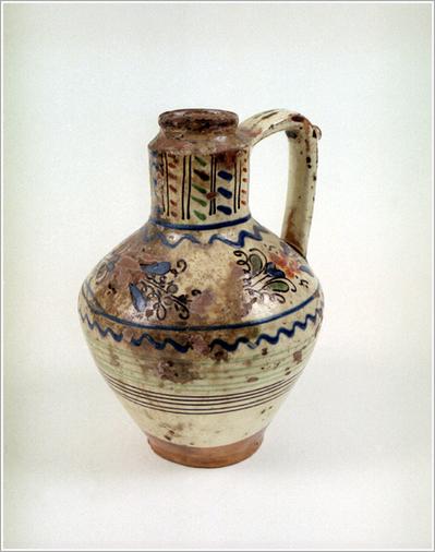 Origin: Tótkomlós Technique: Whte glazed, colourful flowers on the side, linear ornaments, with a draft hole on the top.Size: h. 40 cm Bottom: 10.5 cm Orifice: 6 cm