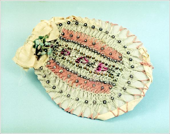 Origin: Szarvas Technique: Crocheted from light blue and pink silk yarn, decorated with colored pearls. Size: L: 29 cm Sz: 23 cm