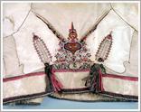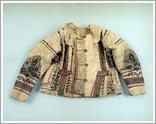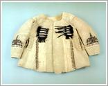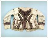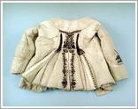 sleeved doublet Origin: Tótkomlós Technique: Made from tan silk brocade with rose motifs, Light brown lace on the chest and collar, long, tight sleeved festive costume. Size: L: 50 cm W: 124 cm |
