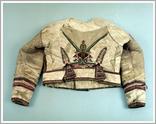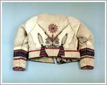 the front of a sheepskin waistcoat Origin: Szarvas Technique: Sewed from whitened sheepskin with long waist, hibiscus red and black, on the back and the sleeves and at the front. Size: W: 58 cm L: 136 cm |