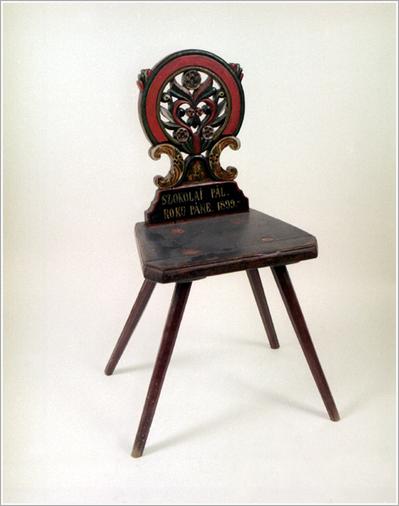 "Origin: Tótkomlós Technique: Carved from oak, Baroqe styled back, arched cuttin on the edge, pierced carving: red, white, brown, green flowers on branches, writing on blue basis: ""Szokolay Pál roku páne 1899"""