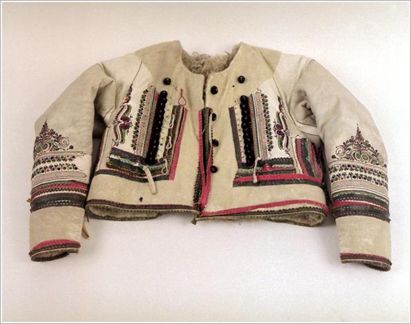 Origin: Békéscsaba Technique: Work of a furrier from Csaba, sewed from white sheepskin, hide rope, rich embroidery with colored silk yarn, lead buttons at the front .Size: W: 150 cm L: 40 cm