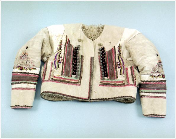 "the front of a fur lined short overcoat ""bekecs"" " Origin: Békéscsaba Technique: Sewed from whitened sheepskin, embroidered with red,blue, violet, green coloured silk yarn on the back, sleeves and at the front, red, black, green, white hide rope onthe edge and the sleeves, buttoned at the front, leatherspun buttons. Size: L: 42 cm W: 138 cm