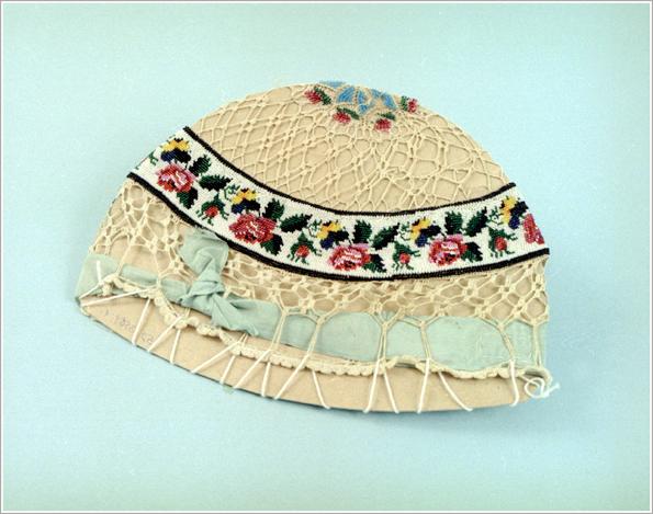 Origin: Békéscsaba Technique: Bonnet, netted from corded cotton, a motif of a star on top, tied with a blue ribbon. Size: L: 17 cm W: 30 cm