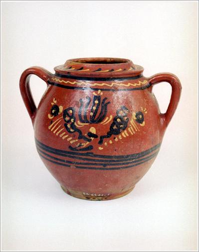 Origin: Tótkomlós Technique: Bellied, glazed ceramics with an inverted rim and a small pouring lip at the bottom. SIZE: H: 21.5 cm Orifice: 10 cm Bottom: 10 cm