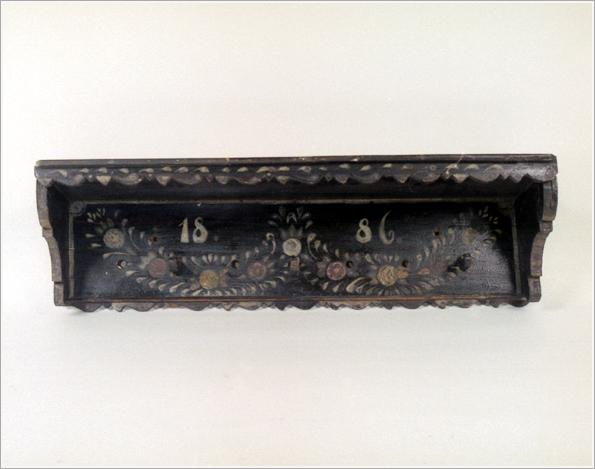 "Origin: Békéscsaba Technique: pine-wood, sawn, hanging, with rim, brown basis, hand-painted flowers, writing: ""1886"". Size: L: 73.5 cm W: 21 cm H: 22 cm"
