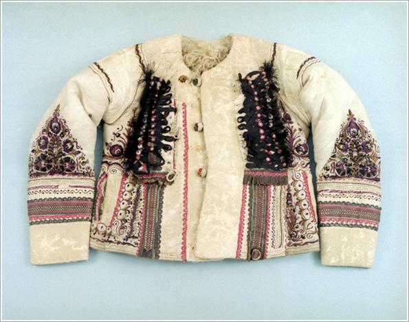 the front of a sheepskin waistcoat Origin: Tótkomlós Technique: Sewed from white sheepskin, short, loose waist, rich embroidery on the back, sleeves and at the front. Hibiscus coloured hide ropes around the pockets, Buttons covered with leather, facing cocks on the back. SizeL: 51 cm W: 150 cm
