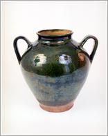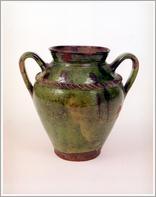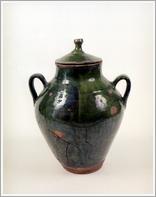 butter jar Origin: Békéscsaba Technique: Green-glazed ceramic pot with two handles and convex ornaments on the shoulder. Size: H: 21.5 cm Bottom: 9 cm |