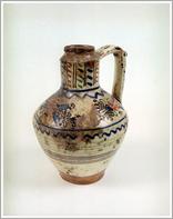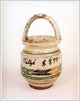 earthen mug Origin: Békéscsaba Technique: Bellied, green glazed with parallel hollow line ornaments, usually honey and jam was stored in it. Size: H: 28 cm Orifice: 12 cm |