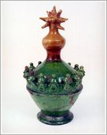 chimney ornament Origin: Tótkomlós Technique: Green-glazed, with 15 buttons at the side, yellow-glazed, gnarled ornaments on the top. Size: H: 32 cm Bottom: 11 cm |