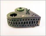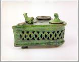 ink-well Origin: Tótkomlós Technique: Green-glazed ink-well on four legs, shape of a chest, deepened in the middle, with pierced ornaments on the side and the back. Size: L: 22 cmW: 16 cm W: 17 cm |