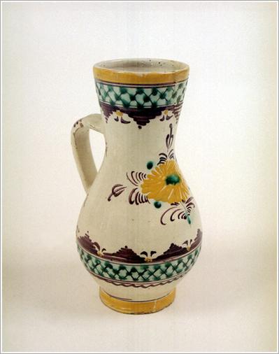 Origin: Mezőberény Technique: Made by a potter from Berény, white-glazed, yellow flower in the middle, green and brownish violet squared and dotted stripes on the two rims. Size: H: 23 cm bottom: 7.5 cm