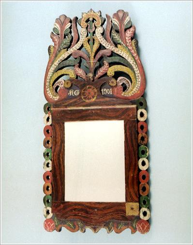 "Origin: Tótkomlós Technique: Profiled pine-wood frames, wide, pierced, convex carving on the top, red, white, green flowers, Initials: ""Sz O"" and ""1901"" Size: W: 33 cm L: 72 cm"