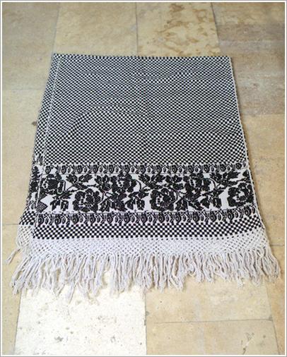 Origin: Békéscsaba Technique: Homespun made of cotton yarn, square motif weaved from black and white cotton, motifes of roses and leaves Size: L: 172 cm W: 127 cm