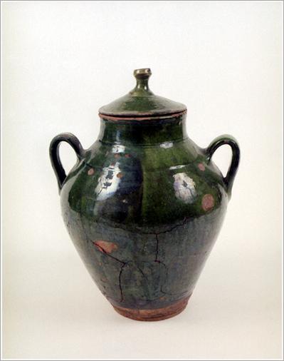 Origin: Békéscsaba Technique: Bellied, green glazed with parallel hollow line ornaments, usually honey and jam was stored in it. Size: H: 28 cm Orifice: 12 cm