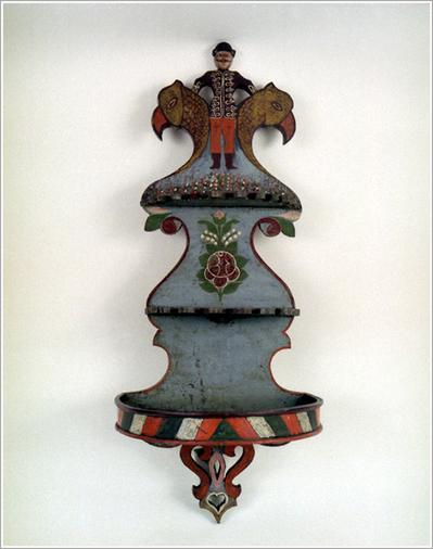 Origin: Tótkomlós Technique: Made of pine-wood, with semicircular shelves, two-headed stylized eagle and a hussar on the top, convallaria on blue basis, motif of roses, the bottom shelf is painted to red, white and green