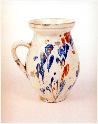Origin: Békéscsaba Technique: Brown and blue sprinkled dots on light brown basis. Size: H: 18 cm Bottom: 7 cm