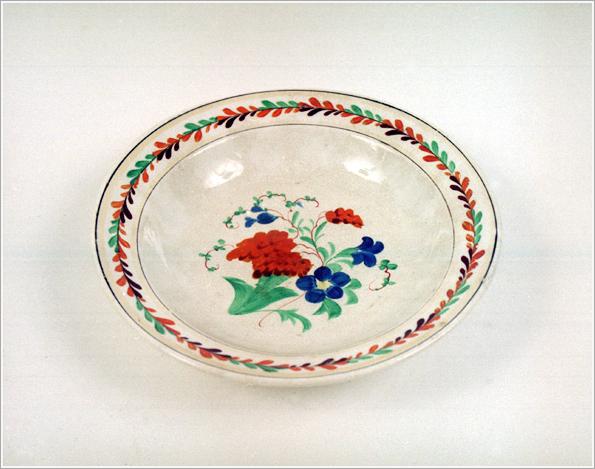 Origin: Tótkomlós Technique: Plate made from hard ceramics, green ,brown and carmine garland on the rim, blue and red flowers at the bottom. Size: H: 4.5 cm Orifice: 22.5 Bottom: 12 cm
