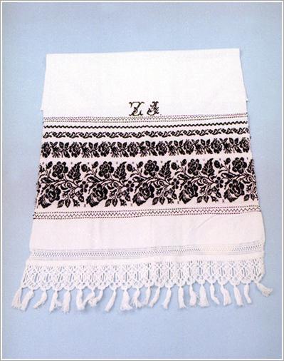 mourning cloth "Origin: Békéscsaba Technique: Linen made of black cotton yarn with cross-fibred motifs in several rows, at one end the initials of ""Z J"" made from black cotton yarn with cross-fibred embroidery, at the other end ham-stiching weaved with black cotton. Size: L: 102 cm W: 60 cm"
