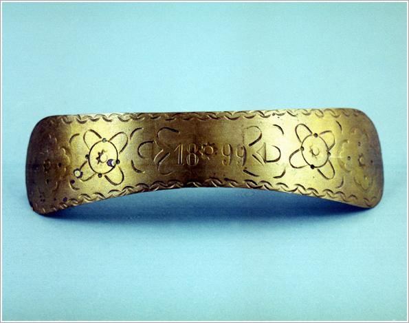 "Origin: Mezőberény: Technique: Made from brass-sheet, both rounded ends are arched, knocked motifs and date: ""1899"" Size: L: 16 cm W: 3.5 cm"