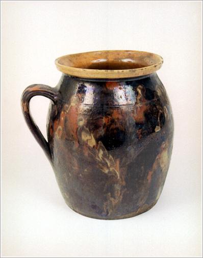 Origin: Békéscsaba Technique: Yellow glazed, run paintind, one-handled ceramic pot. Size: H: 22 cm Bottom: 11 cm