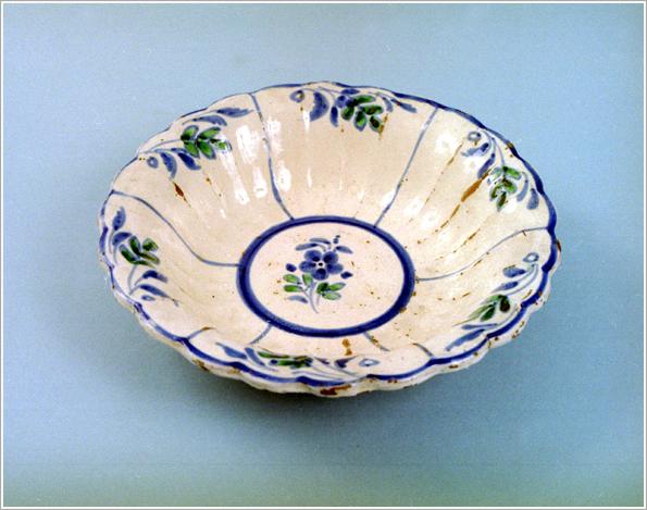 Origin: Tótkomlós Technique: Yellow-glazed inside, cream outside, narrow, blue stipes on the rim, a five-petalled flower at the bottom.Size: H: 7 cm bottom: 14 cm
