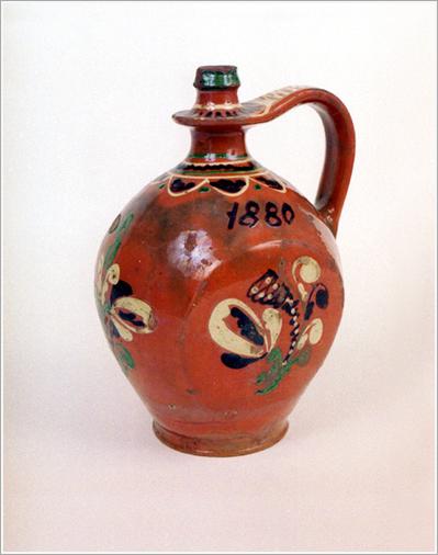 "Origin: Tótkomlós Technique: Flat sides with green, browm ornaments drawn with a stick on brownish red basis, ""Roku 1880"" Size: H: 25 cm bottom: 9.5 cm"