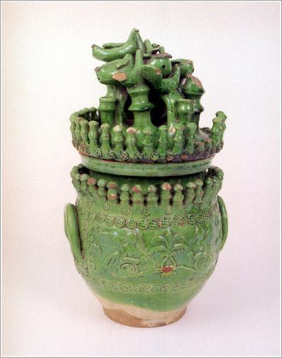 Origin: Tótkomlós Technique: Green glazed, con vex ornament round on the side, facing angels, birds on the lid. Size: H: 20 cm Bottom: 10 cm